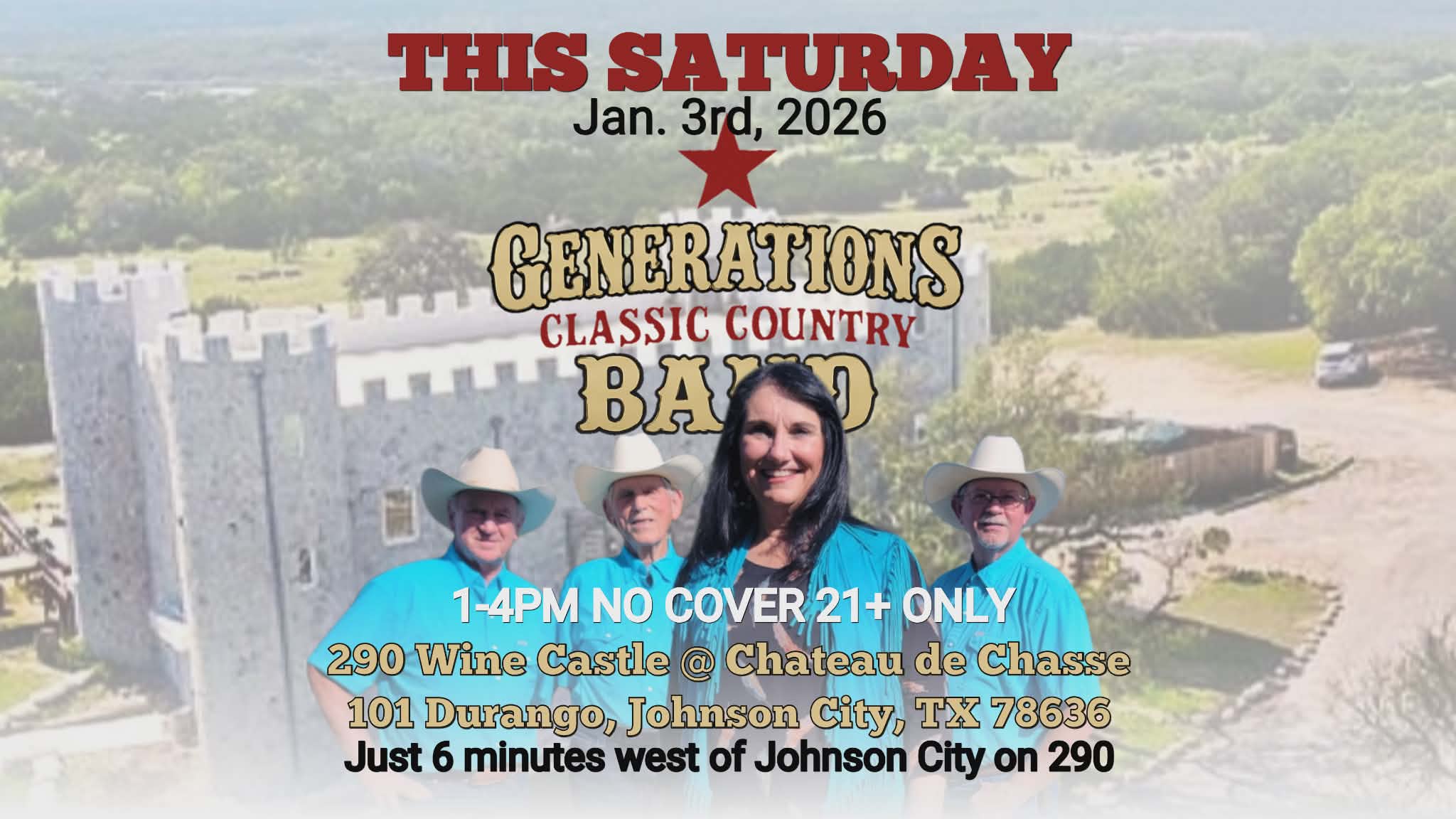 Join us THIS SATURDAY, January 3rd, 2026, as the Generations Classic Country Band brings classic country favorites to the stunning Chateau de Chasse, also known as the iconic 290 Wine Castle.